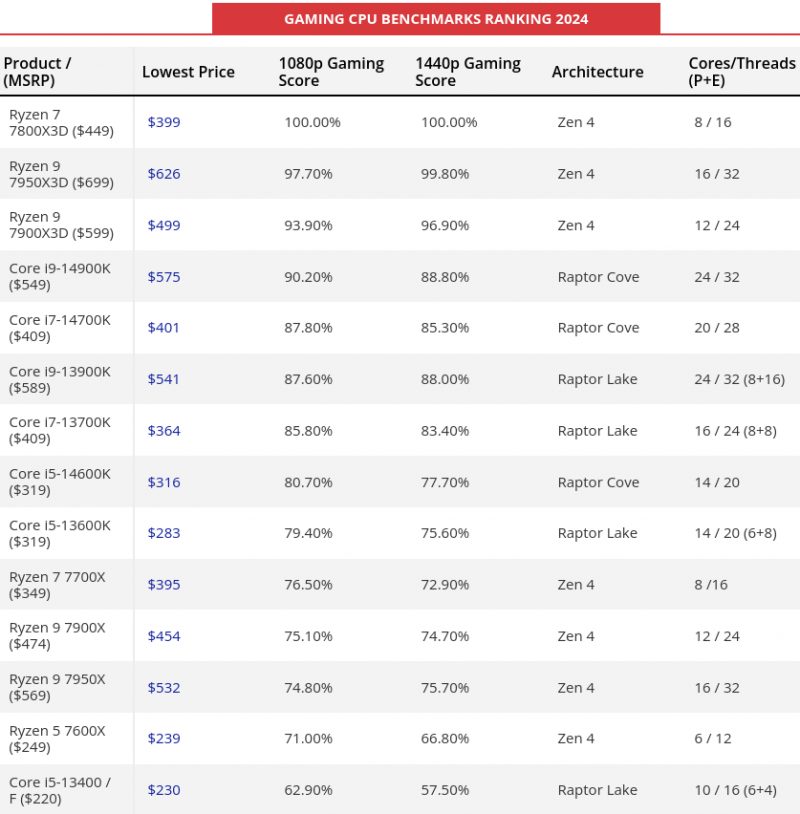 Пожалуй, единственным достойным конкурентом процессорам Ryzen является Core i5-13600K за $283, стоящий дешевле Core i5-14600K, и уступающий ему не более 2%. Впрочем, Ryzen 5 7600X в целом выглядит более разумным выбором, в том числе и потому, что платформа AM5 оставляет возможность для апгрейда в будущем (а вариация без встроенного видеоядра с в 1,5 раза меньшей ценой, именуемая Ryzen 5 7500F, вообще не имеет конкурентов).