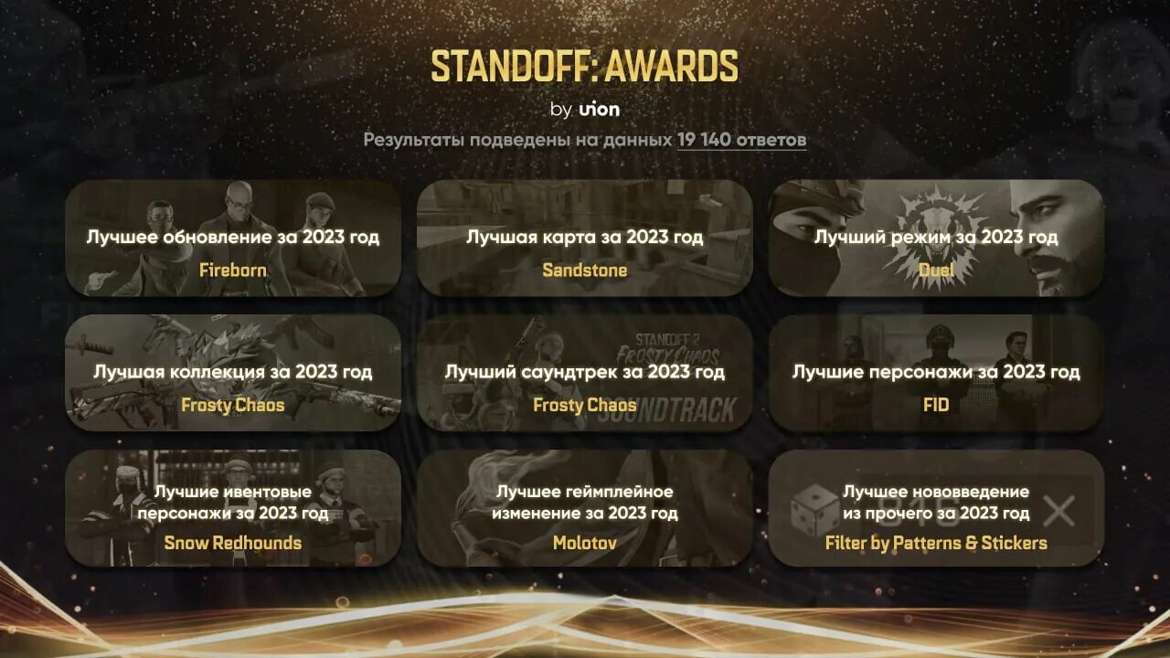 Все реализованные разработчиками изменения были поделены на девять номинаций. В голосовании приняли участие 19 тыс. геймеров. Согласно результатам опроса, самой популярной картой в Standoff 2 в 2023 году стала Sandstone, «Дуэль» — самым востребованным режимом, а патч под названием Fireborn — важнейшим обновлением.