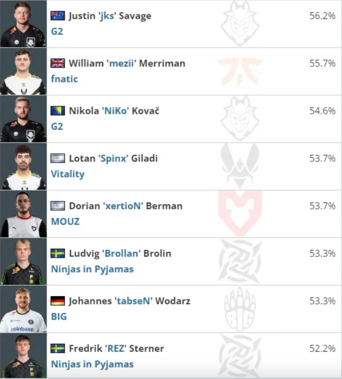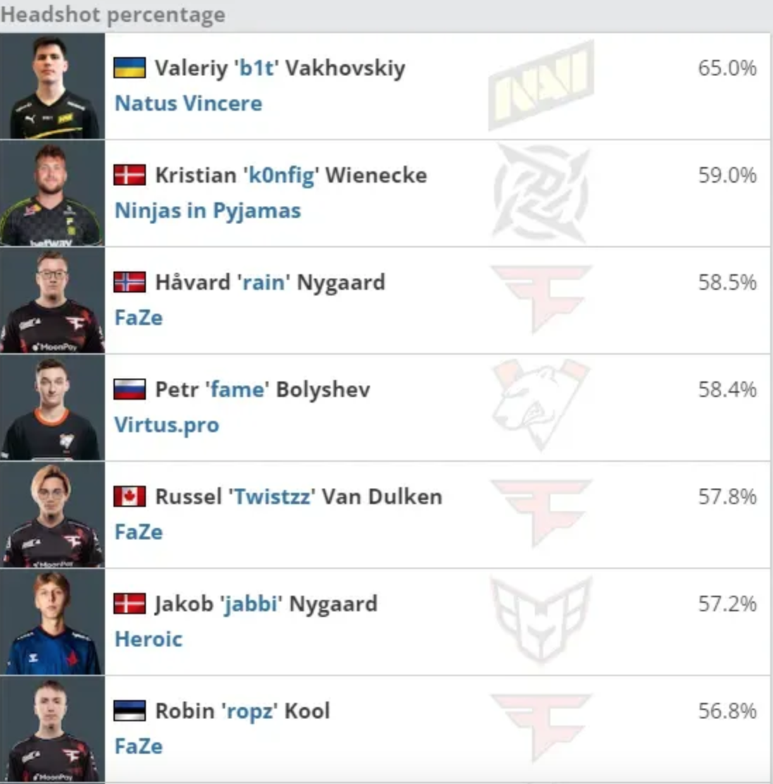Вторым по проценту хедшотов оказался датчанин Кристиан k0nfig Винеке. Тройку лидеров замкнул представитель FaZe Clan Ховард rain Найгард. В пятерку лучших также попали киберспортсмены Петр fame Болышев из Virtus.pro и Рассел Twistzz Ван Далкен из Team Liquid.