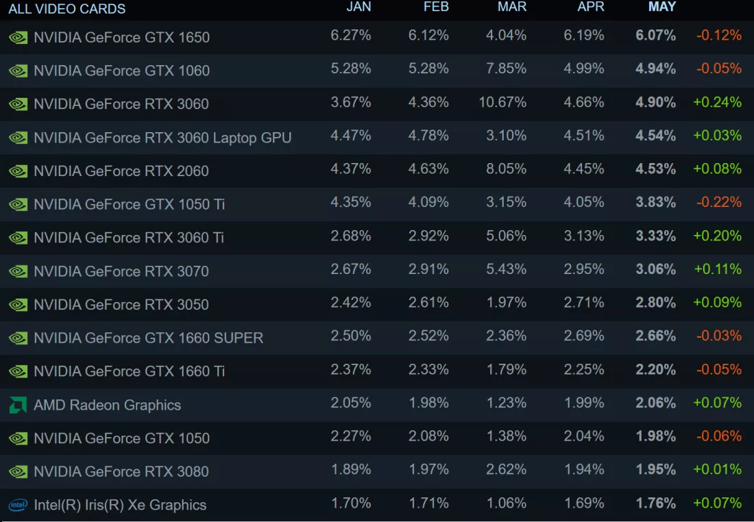 Еще немного и GeForce RTX 3060 обойдет своего идейного предшественника, GeForce GTX 1060, доля которого понемногу снижается из-за роста системных требований новых игр. Текущий лидер в лице GeForce GTX 1650 также начинает терять расположение геймеров, на что в немалой степени влияет скромный объем памяти.