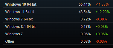 Что же, есть все основания полагать, что с Windows 7 придётся попрощаться даже самым большим фанатам этой операционной системы. Всё дело в том, что до недавнего времени эта ОС поддерживалась сервисом Steam. Как стало известно, с 1 января 2024 года владельцы компьютеров, на которых установлена Windows 7, не смогут пользоваться фирменным приложением. Отмечается, что на этот раз никаких альтернативных решений нет. Если вам нужен игровой магазин, то придётся поставить более современную операционную систему. Если Windows 7 вам так дорога, то нужно отказаться от Steam и перейти к пиратским копиям игр. К слову, вместе с «Семёркой» состоится отказ и от всех версий Windows 8, поэтому владельцам этой операционной системы также стоит как следует задуматься. Ну а если обратить внимание на свежую статистику, отражающую показатели на 1 декабря 2023 года, то можно заметить, что в настоящее время 55% всех пользователей Steam используют Windows 10. Чуть более 43% у Windows 11, ну а все предыдущие версии Windows имеют порядка 0.95% распространённости.